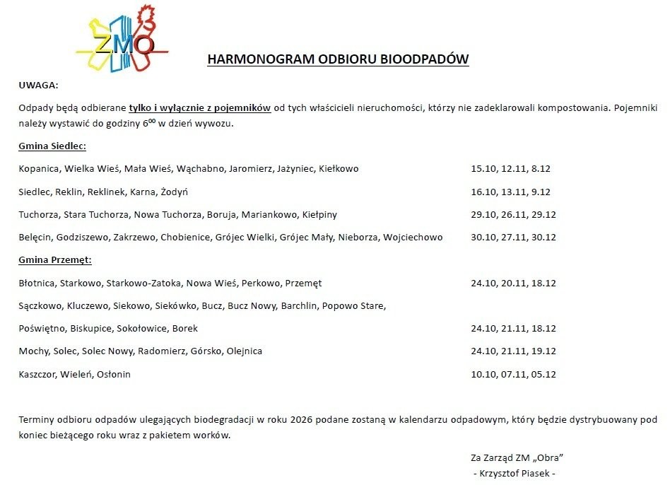 Harmonogram odbioru bioodpadów na IV kwartał 2025